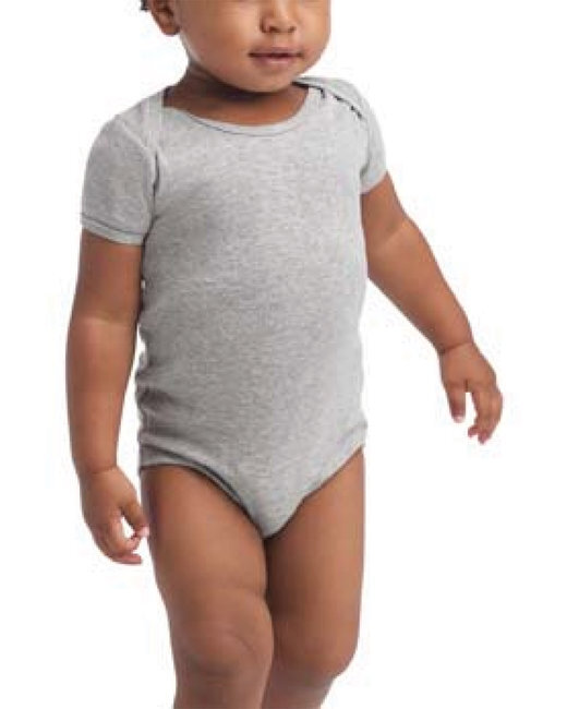 5.5 oz., 100% ringspun cotton; Sport Grey: 90% cotton, 10% polyester; High-stitch density for smoother printing surface; Tear away label; Rolled forward shoulder; Double-needle sleeve and bottom hem; Quarter-turned to eliminate center crease ; Lap shoulder construction; Rib binding with double-needle stitching on neck, sleeves and leg openings; 3-snap bottom closure; CPSIA tracking label compliant ; Gildan's manufacturing process utilizes 45% renewable energy; Gildan’s Community Investment Program supports education, the environment, humanitarian aid and active living in the communities we do business in;