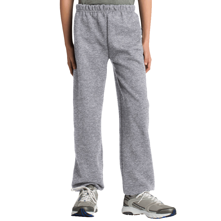 Gildan Heavy Blend 8.0 Ounce Youth Sweatpants. 8.0 ounce 50/50 cotton/polyester sweatpants with covered elastic waistband and drawcord. Elasticized cuffs. No side seams. Tear away label. Youth sizes. No pocket. No side seams. No drawstring. Elastic waistband and elasticized cuffs. CPSIA Tracking Label Compliant. Tear away label.