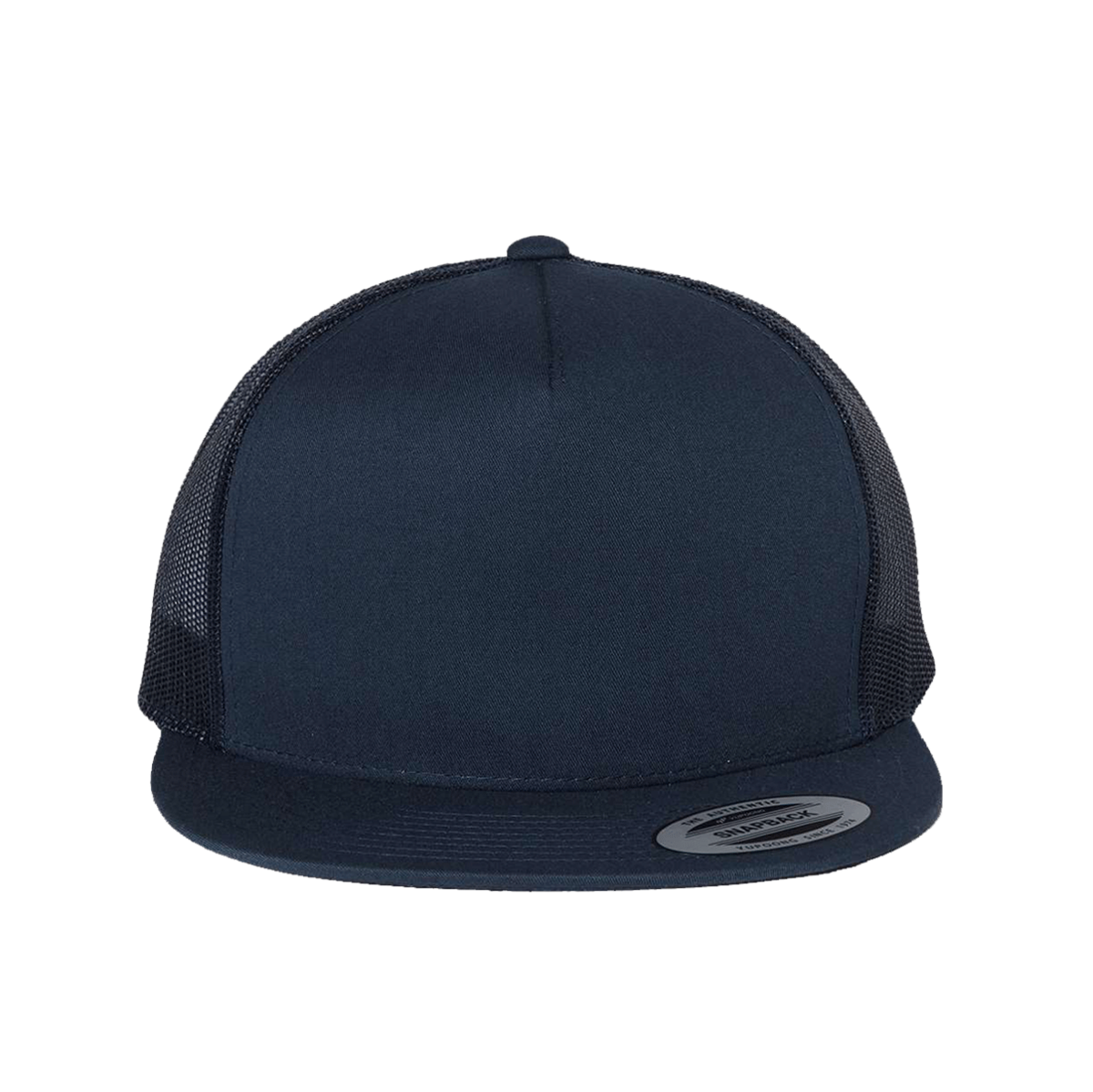 Yupoong Classic Truckers Cap. 47% Cotton/25% Polyester/28% Nylon. Trucker mesh back, white plastic snap. Hard buckram. Matching undervisor. High profile, 5 panel cap with 4 crown and flat visor.
