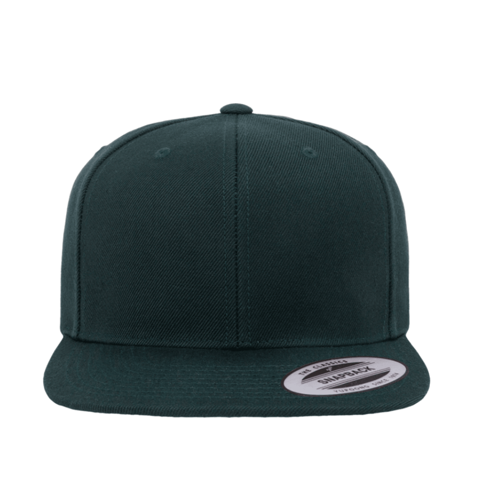 Yupoong 6-Panel Classic Snap-Back Solid Cap. 6 panel high profile 3 crown. Flat visor with green undervisor. 80/20% acrylic/wool. Classic shape cap with a retro edge. Matching plastic snap. Hard buckram. Premium wool blend, The 6089MT has contrasting eyelets and top button, visor and plastic snap.