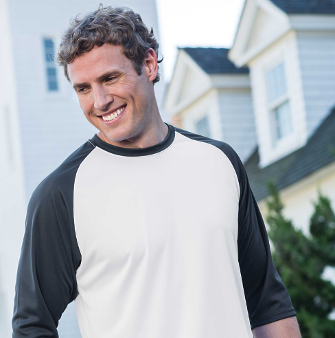 Badger Adult B-Core Poly 3/4 Sleeve Baseball Shirt. 100% polyester moisture management/antimicrobial fabric. Contrast ¾ raglan sleeves and collar. Double-needle shirt tail hem. Badger logo heat seal on left sleeve. Ships from Statesville, NC.