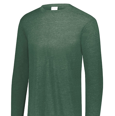 Augusta Adult long sleeve Triblend Tee. 3.8 ounce, 50% polyester/38% cotton/12% rayon tri-blend knit. Fits loose to body. Tear away label. Crew neck. Set-in sleeves with rolled forward shoulder seam