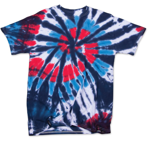 Dyenomite Adult 5.3 Ounce Cut Spiral T-Shirt. Kaleidoscopic color and design transport this shirt and its wearer back in time! Pre-shrunk 100% cotton. Double-needle stitched neckline and sleeves. Shouder-to-shoulder taping.