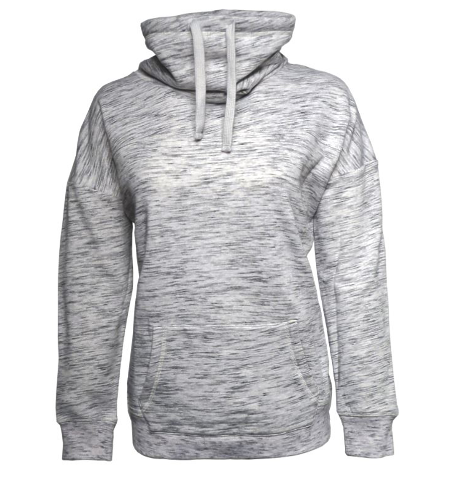 J America Ladies 7.25 Melangé Fleece Cowl Neck. 7.25 oz. 60/40% Cotton/ Polyester Melange fleece. Pouch pocket and fabric lined cowl neck. Front chest & back yoke. Rib waist & cuffs. Ships from Fowlerville, MI.