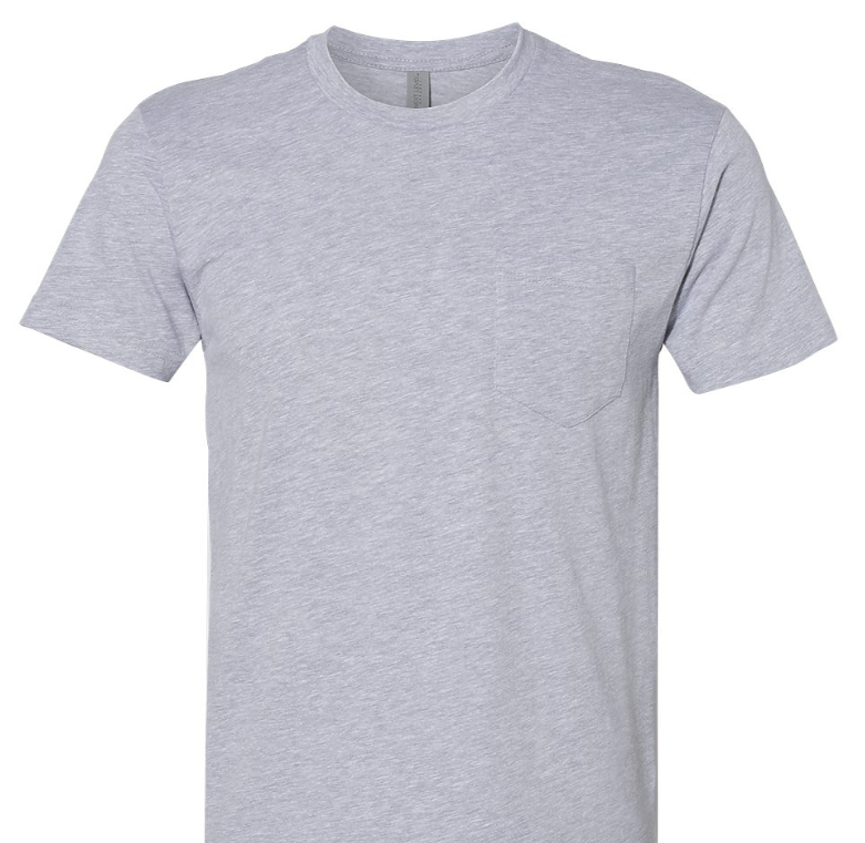 Next Level Unisex 4.3 Ounce Cotton Pocket T-Shirt. 100% combed ring-spun cotton 32 singles, 4.3 ounce jersey. 1x1 baby rib set-in collar. Five point left chest pocket. Tear away label. Side seamed. 3/8 shoulder to shoulder binding.