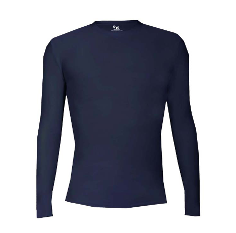Badger Adult Pro Compression Long Sleeve Tee. Badger heat seal logo on left sleeve. 83% Polyester/17% Spandex moisture management fabric. Self-fabric collar. Stretch Body Fit. Double-needle hem.