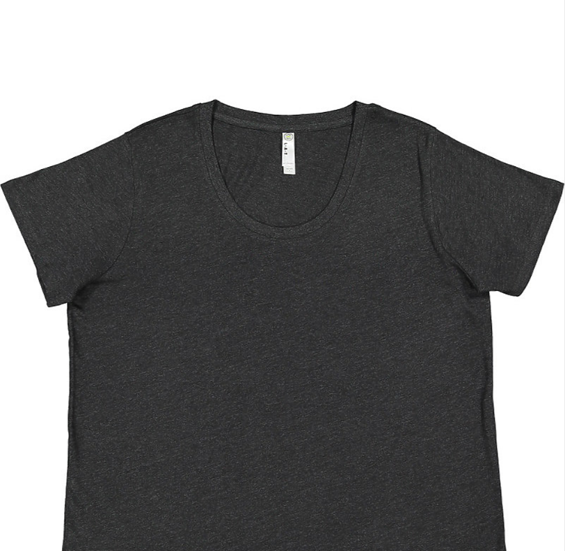 LAT Ladies 4.5 Ounce Curvy Fine Jersey Crewneck T-Shirt. 4.5 ounce 60/40% combed ringspun cotton/polyester fine jersey fabric. Ribbed collar. Self-fabric back neck tape. Double needle sleeves and bottom hem. Side seam construction. EasyTear label.