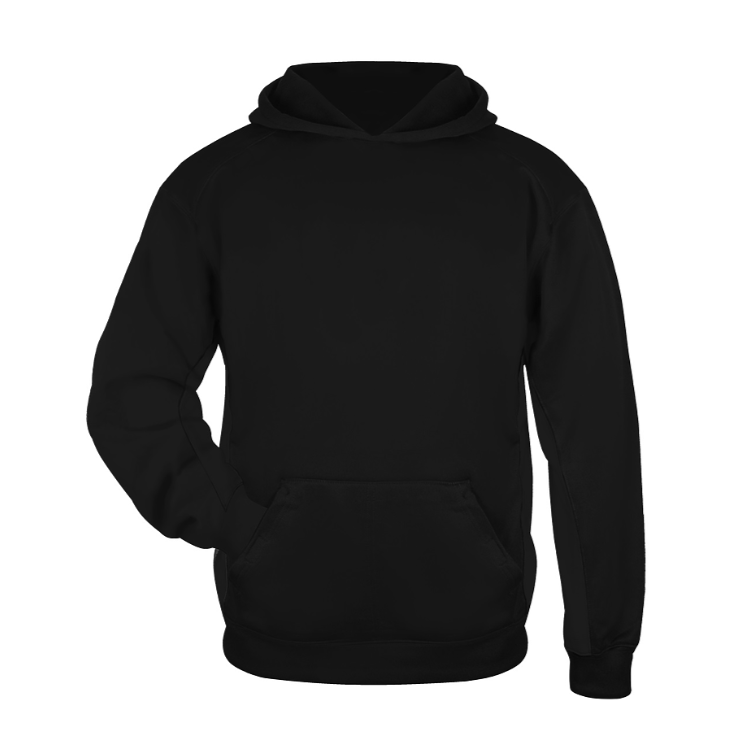 Badger Youth Performance Fleece Hoody. 100% Polyester moisture management fleece fabric. Badger sport paneled shoulder for maximum movement. No drawcord. Textured waffle weave side and underarm panels. Front pouch pocket with two hook and loop closure top pockets. Embroidered badger logo on left sleeve. Poly rib cuff and waist.