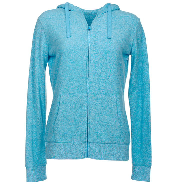 J-America Ladies Cozy Full Zip Hood. 5.75oz 68% Polyester 24% Rayon 4% Spandex. Heathered Brushed Jersey. Scuba neckline with dyed to match .drawcords Concealed zipper placket. 2x2 rib cuffs and waist. Set on pouch pocket.