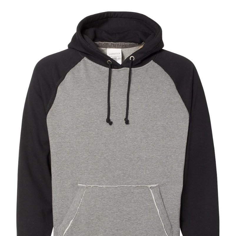 J America Adult 9.5 Ounce Vintage Heathered Hood. 9.5 ounce, 80/20% Ringspun Cotton/Polyester heather fleece fabric. Contrast hood and sleeves. 1 x 1 Rib, waist and cuffs. Raglan sleeve construction. Rough edge seams. Garment enzyme washed.