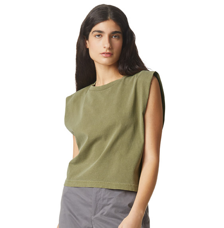 American Apparel Ladies 6.0 Ounce Garment Dye Muscle T-Shirt. 100% US Cotton, 6.0 Oz/SqYd. 18/1. The Heavyweight Cotton collection offers rough and tumble concert must-haves. Garment dyed for that vintage, faded look and almost no shrinkage at home. Wide rib collar. Taped neck and shoulders for comfort and durability. Structured shoulders. Boxy fit, slightly cropped, side seamed body. Recycled tear away label. Made with OEKO-TEX certified low-impact dyes.