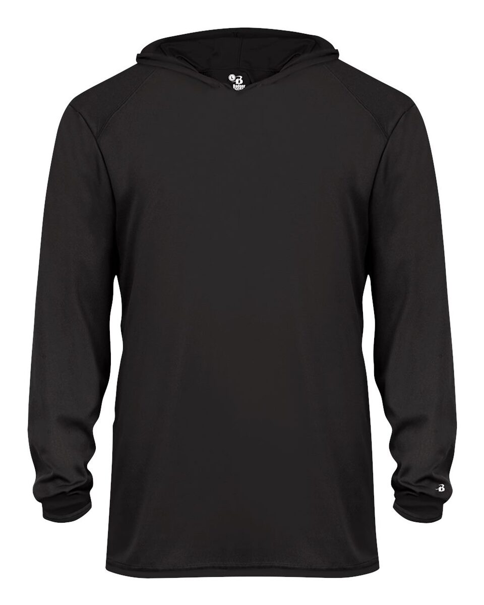 Badger Youth Hooded Long Sleeve Shirt. 100% Polyester moisture management/antimicrobial fabric. Badger sport shoulder for maximum movement. Self-fabric hood. Badger heat seal logo on left sleeve