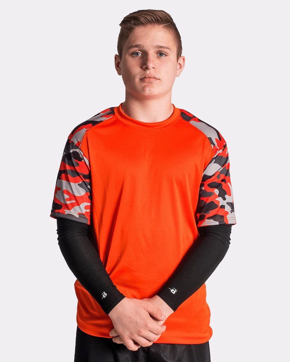 Badger Adult Camo Sport Tee. 100% Polyester moisture management/ antimicrobial performance fabric. Sublimated camo shoulder panels & sleeves. Self-fabric collar - Double-needle hem. Badger heat seal logo on left sleeve.
