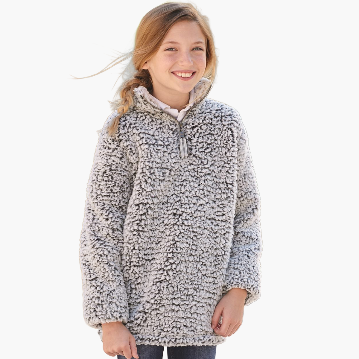 J-America Youth Epic Sherpa Quarter Zip. 9.0oz High loft 100% Polyester Sherpa. 1/4 Zip placket & self fabric collar. Set-in sleeves and sideseam waist vents