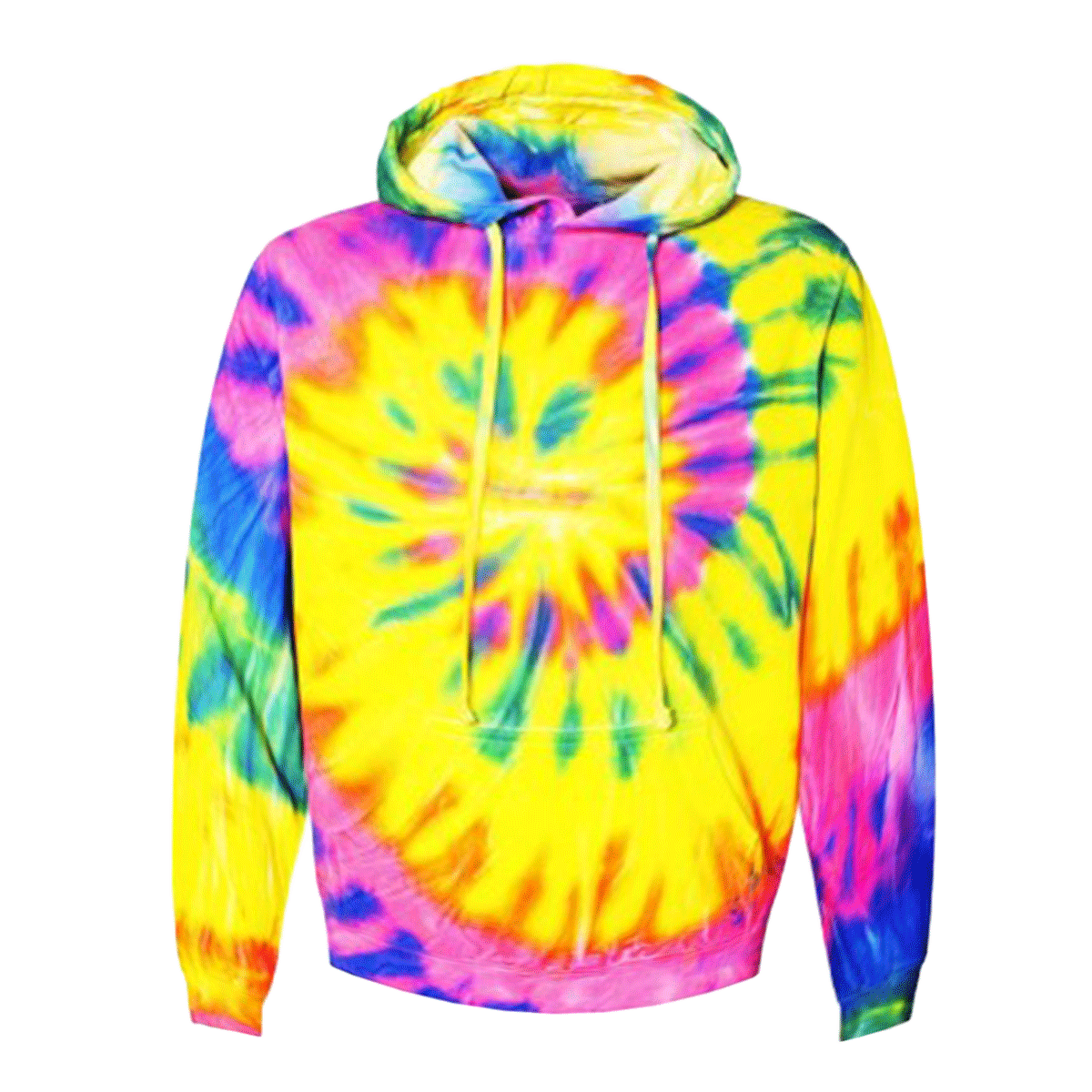 Dyenomite Adult 7.5 Ounce Multi-Swirl Hooded Pullover. 7.5 ounce, 80/20% cotton/poly sweatshirt with a jersey lined hood and matching drawstring. Ribbed knit cuffs and relaxed waistband. Side seamed body and double stitching throughout. Youth hoods do not have drawcords. Front pouch pocket.