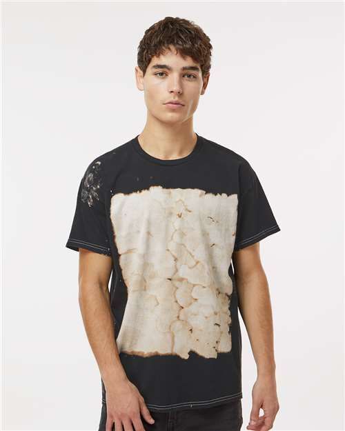 Dyenomite Adult 5.3 Ounce Bleach Wash T-Shirt. 100% cotton, 5.3 ounces. Double-needle stitched neckline & bottom hem. Shoulder to shoulder taping.