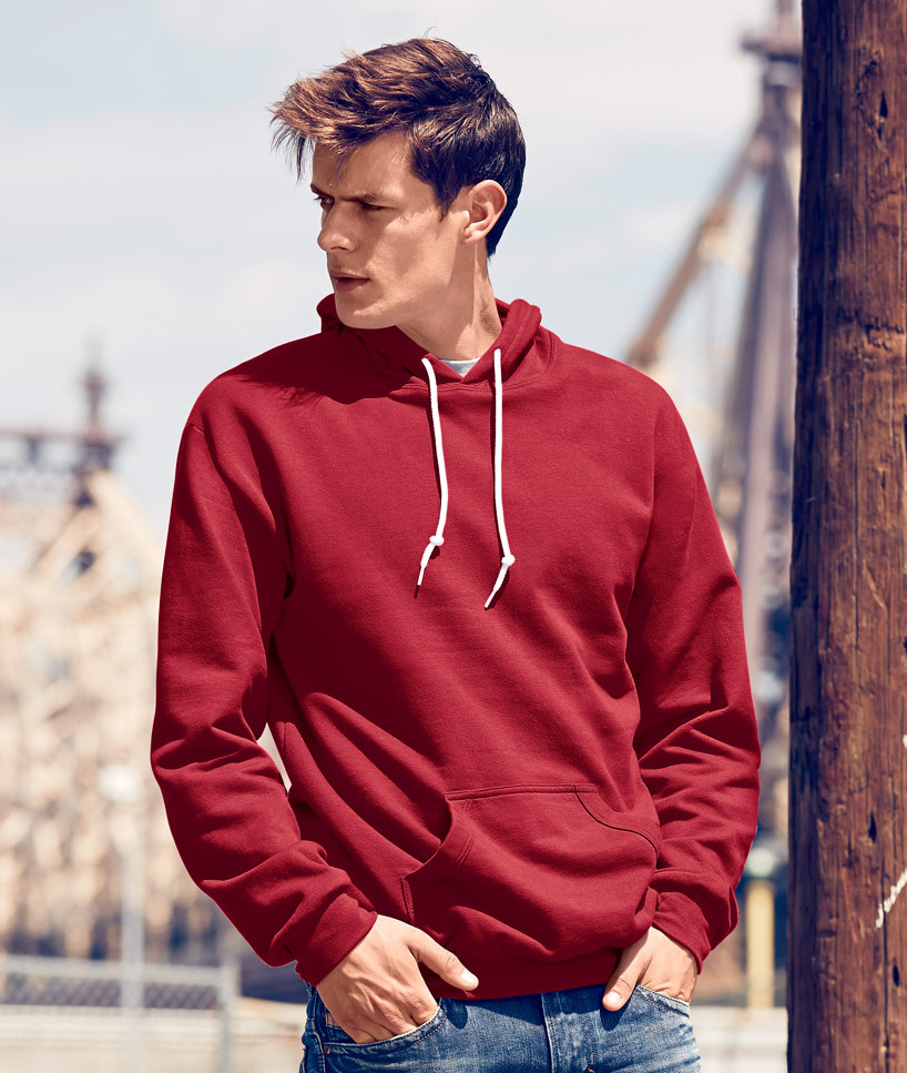 preshrunk 75% combed ring-spun cotton/25% polyester fleece • 7.2 oz. • 30 singles • classic fit • tubular construction • double-needle topstitched neck • 1/4" white neck tape • unlined hood with white drawcord • back patch • 2” rolled forward shoulders • 1x1 ribbed cuffs and waistband with spandex • woven label • Sizes: XS-3XL